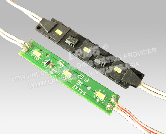 低壓注塑工藝運(yùn)用于各式LED串燈、LED模組等的防水包封中, 對(duì)比傳統(tǒng)灌膠工藝與高壓注塑工藝,具有固化周期短、生產(chǎn)效率高、無(wú)損電子元器件、不良率低,注塑好的產(chǎn)品防水等級(jí)高等特點(diǎn),正被越來(lái)越多的LED廠商采用。