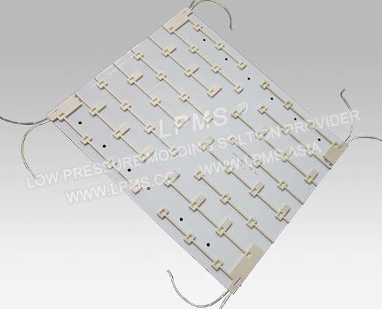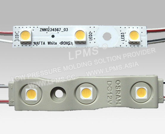 Low pressure molding is also widely used in LED lamp, LED string light, LED module and LED screen. Compare to conventional potting and high pressure molding, low pressure molding cycle time is short, productivity is higher, has no damage to components,and provides water-proof.